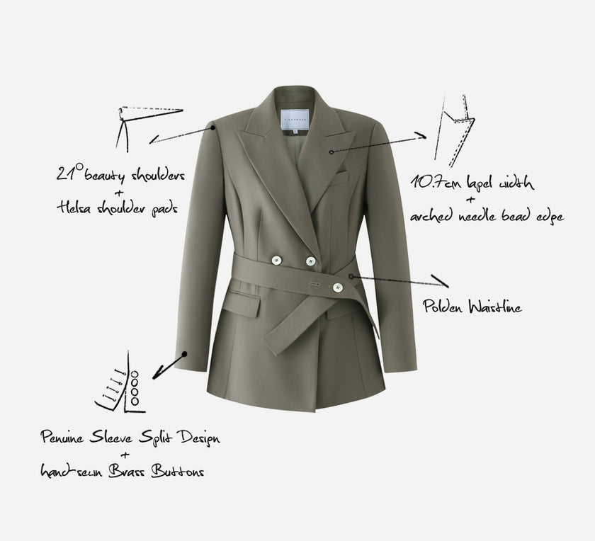 Popularized by celebrities in TV dramas, this suit has gained international fame. It combines classic style with urban elegance, featuring a notch lapel, slight shoulder padding for a professional look, and an adjustable self-fabric belt for a chic silhouette. Made from selected wool, it emphasizes refined texture and resilience. The TieForHer suit merges classic tailoring with modern chic, perfect for workplace wear and creating a unique personal style.
